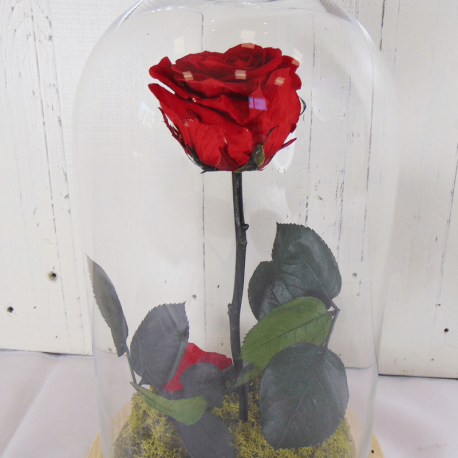 La famosa rosa eterna que aparece en la película de "La Bella y la Bestia". Es una composición de una rosa roja preservada con musgo y pétalos preservados en la base. Todo ello en el interior de una cúpula de cristal sobre madera. Todo es natural, nada es artificial ni de plástico. La rosa, pétalos y musgo han recibido un tratamiento específico para que aguanten varios años impolutos. Mide 25 cm.