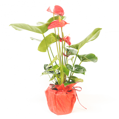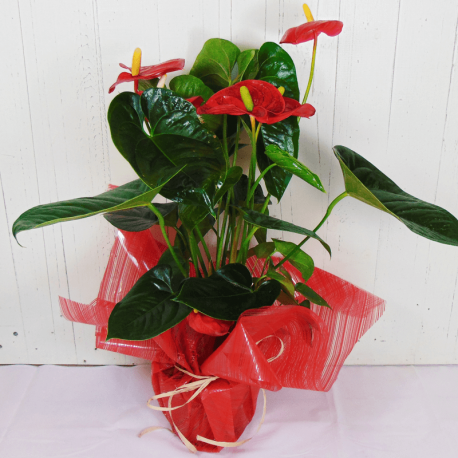 Anthurium grande con flores rojas en maceta y decorado. Tiene un tamaño de entre 60 y 70 cm de altura. Y unos 30-40 cm de ancho.