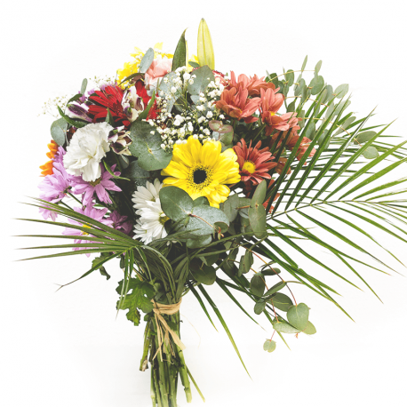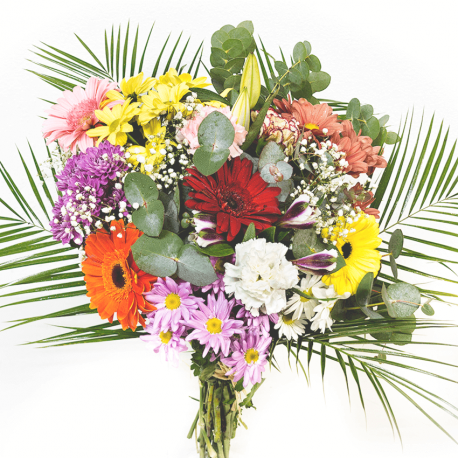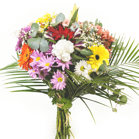 Está compuesto por 5 varas de margarita, 4 gerberas, 1 lilium, 1 alstroemeria, 3 claveles, paniculata, verdes variados y 1 blonda de plástico decorativa.