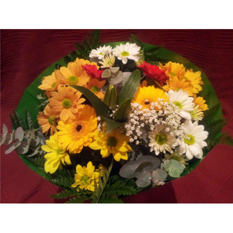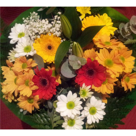 Ramo de flores variadas de tamaño grande. Margaritas, liliums, gerberas, rosas, paniculata... son algunas de las flores que puede contener este ramo, ya que varía en función de la época del año, al igual que los colores. Incluye verdes variados de relleno y de acabado, y un envoltorio decorativo. Sólo te faltará inspiración con la dedicatoria que quieras añadir y la pondremos junto al conservante.