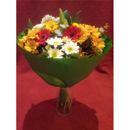 Está compuesto por 4 gerberas, 5 varas de margarita, 1 vara de paniculata y una vara de lilium oriental blanco. Acabado con hojas de helecho y envoltorio decorativo.