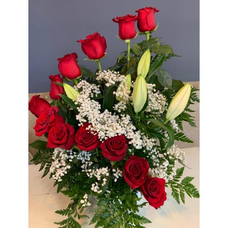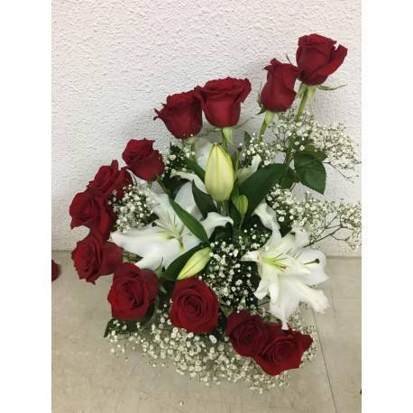 Nuestros Centro de rosas y liliums tienen su original toque de frescura y aroma. Está elaborado con 12 o 24 rosas de color rojo ¡un espectacular rojo brillante! 2 liliums blancos que van colocados en el centro de las rosas y además cuenta con una decoración con panículas blancas, es una composición realmente hermosa.